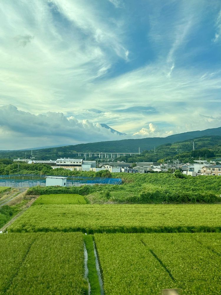お盆帰省の帰りの新幹線。一日中嵐雲に隠れていた富士山がほんの少し見えたので📷✨したら、高速で流れる手前風景に偶然にも青々とした田んぼが写り込みました。夏だな〜🌬️☁️🌦️