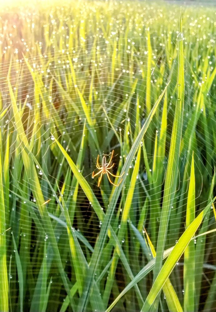 蜘蛛の巣がたくさん張り巡らせている田んぼはきつい農薬をしていないので安全と言われますね