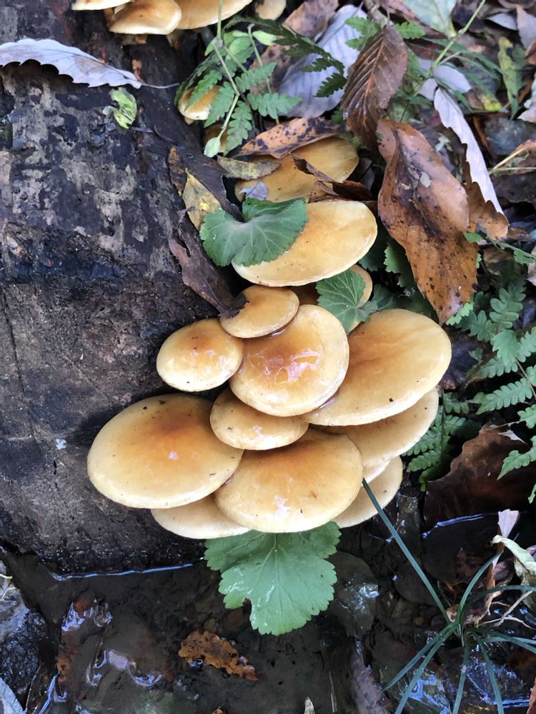 ナメコだあー!必ず枯れ木から出る。ブナかミズナラなら間違い無し。香が良い!開いた傘は特に食感がナメコっぽい!汁なら最高のコンディション。濃い茶の玉ならもっと判り易い。玉ならさっと湯通しして大根おろし和えが。加工木でも、(例:尾瀬の木道)出ます。