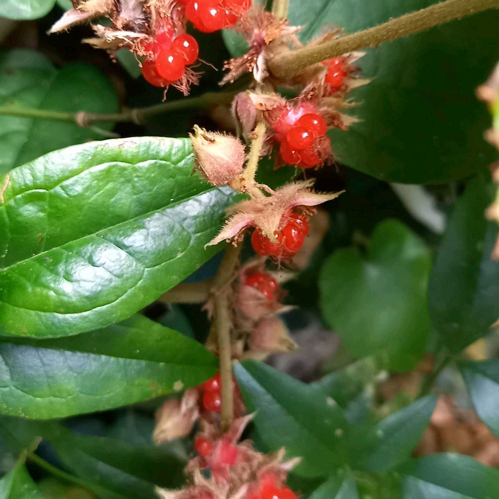 色味の少ない薄暗い山の中で、特にこの時期フユイチゴの艶やかで真っ赤な色は目立ちます。