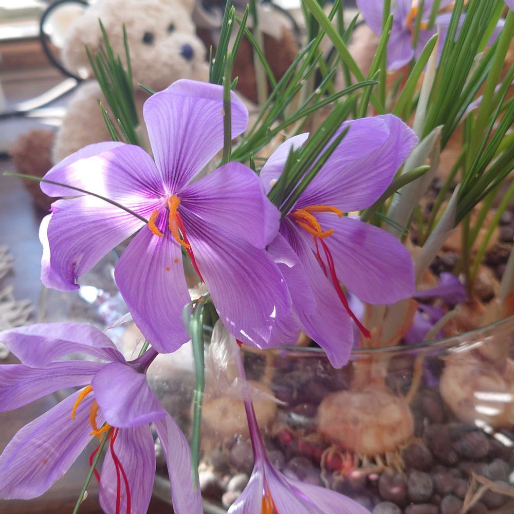 水栽培のサフラン〜出窓から、リビングに移したら、あっという間に開花していて、ビックリ〜💜✨