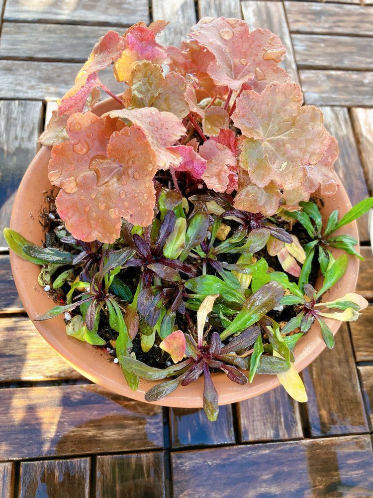 コリウスとベゴニアは寒さで枯れてきていたので撤去。ヒューケラとアジュガは状態が良さそうでしたので新しい土に植えました。