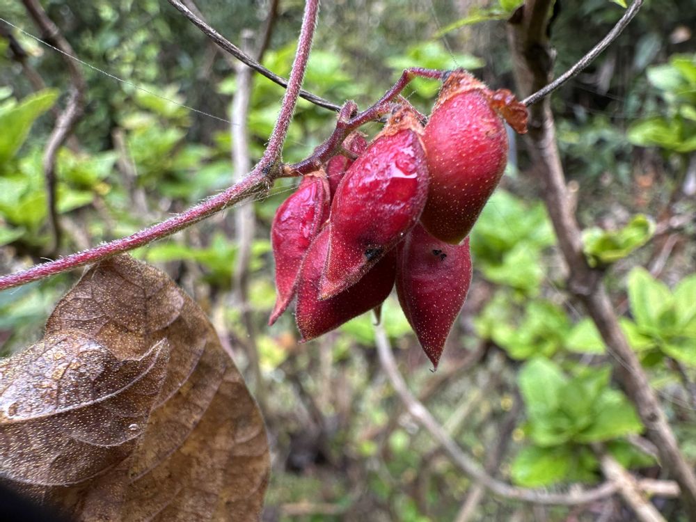 赤い果実の殻と黒い種子が鮮やかなトキリマメですね。結構あちこちにぶら下がっていましたが、全てこのトキリマメでした、タンキリマメとかは見当たらず😊 季節的なものか、エリア的なものか⁉️