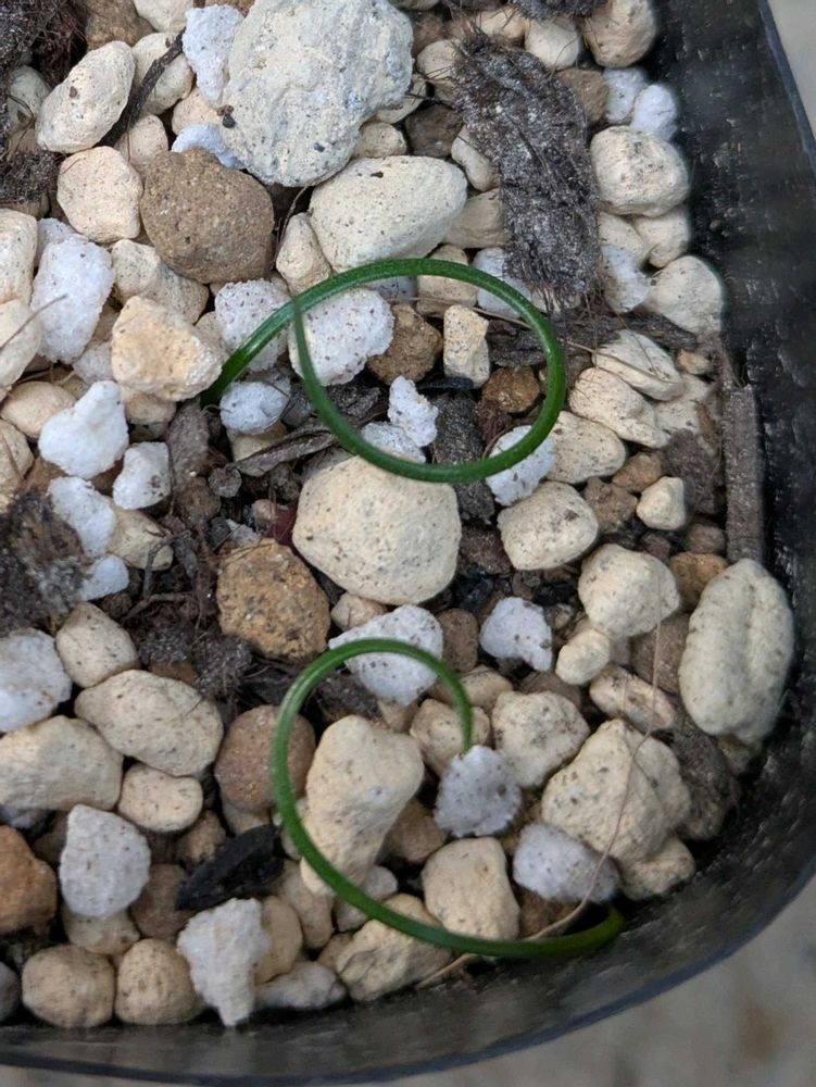 ラッキョウよりほっそ〜い球根を植え付けていた鉢から何かが生えてきました🌱