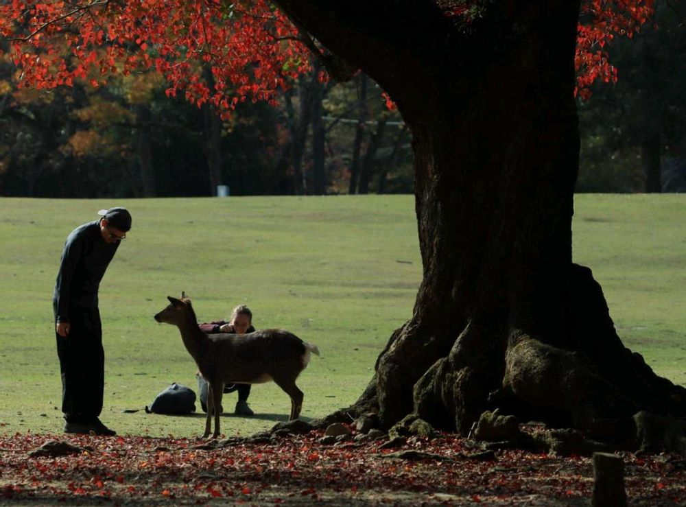 紅葉した木の下で、鹿が外国人観光客におねだりしていました。