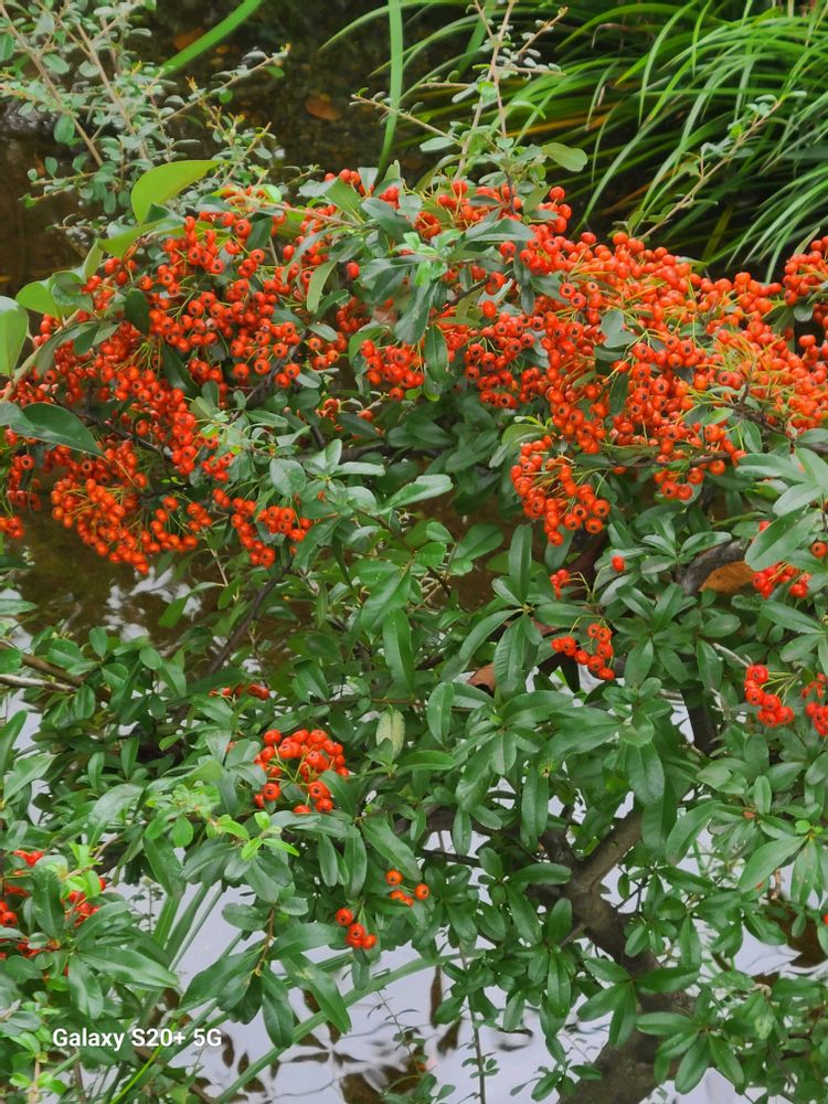 横浜市都筑区佐江戸町の人口川の畔の皇帝ダリアとピラカンサと川の錦鯉です。