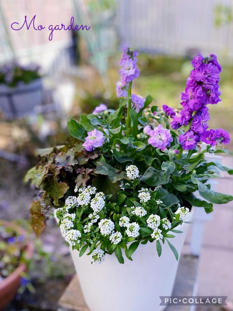 ヒューケラを植えていた鉢が大きかったので、ストックとアリッサムを寄せました♡