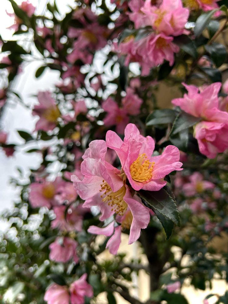 急ぎ足🚶♀️で駅に向かういつもの通勤路。日差しを求めてブロックの上に枝葉を張ったサザンカが満開🌸