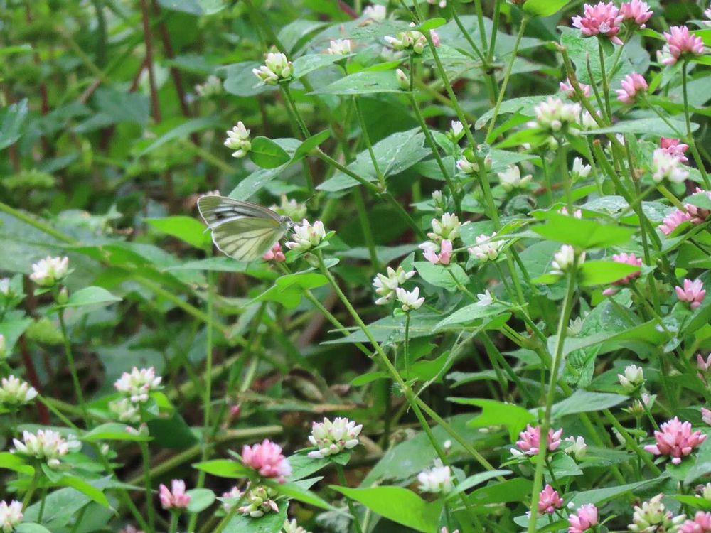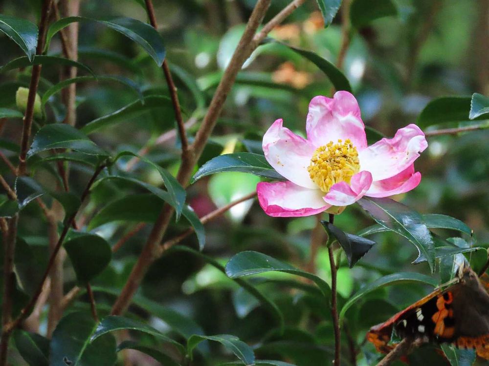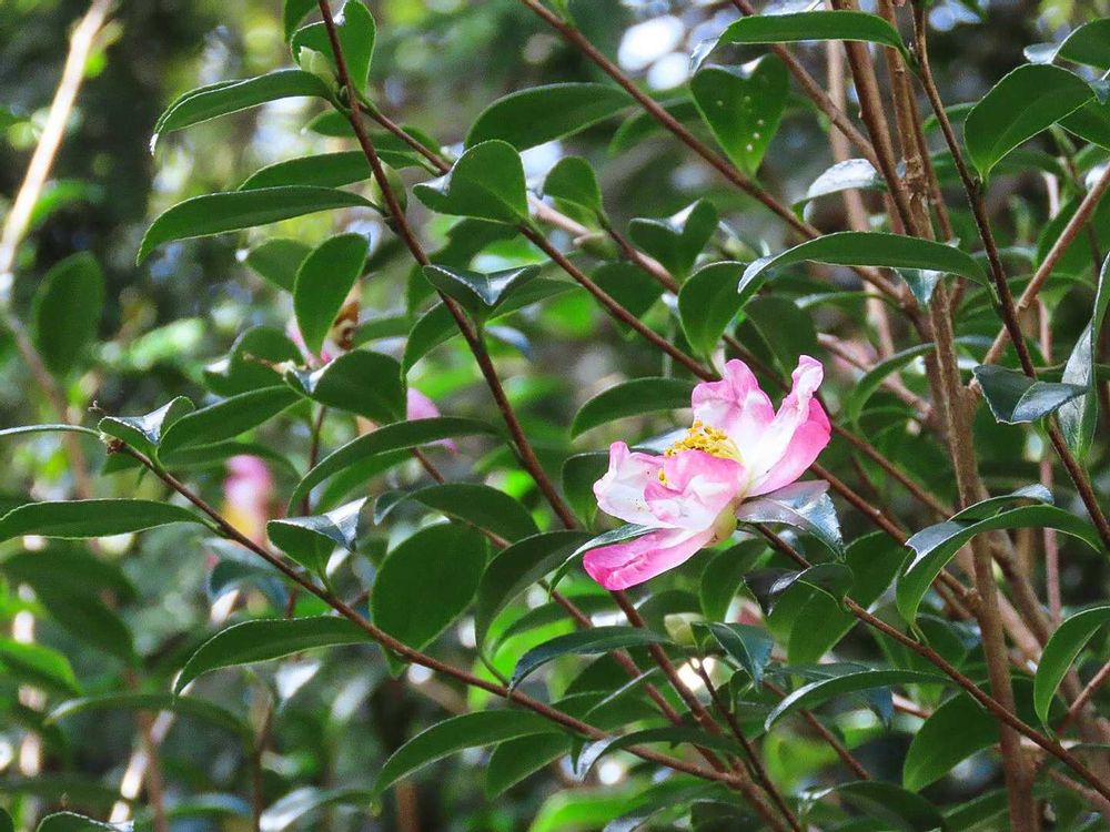 ピンク混じりのサザンカの下には同じ色合いのミゾソバの花