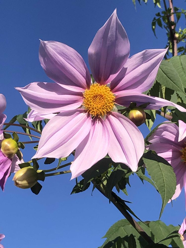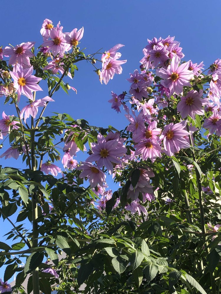 青天を衝く勢いのある「一重咲き皇帝ダリア」をパチリ!📸🌸🌿😄🤗🌞✌️