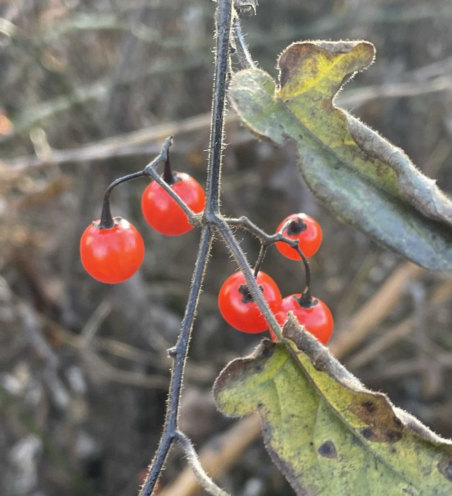 荒れ野にひときわ目につくのが、この真っ赤な実である。白い花が反り返って咲いていた頃は、勝手にイヌホオズキだと思っていた。それっきりよく通る山道なのに、忘れていた。先にイヌホオズキは黒い実になってしまうが、遅れて今頃やっと赤い実になって気がついたのである。