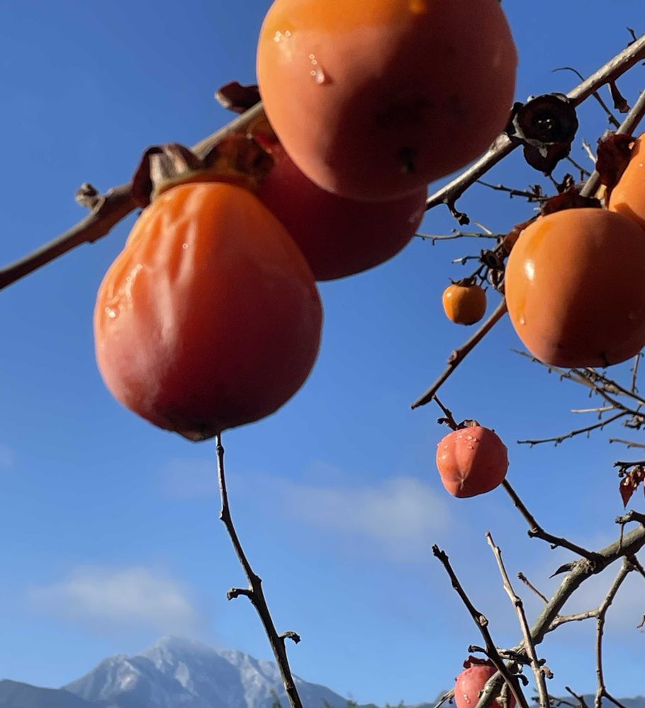 霜でだいぶ甘くなっているようだが、鳥につつかれていないところを見るとまだ渋いのかもしれない。奥の冠雪している山が、甲斐駒ヶ岳の北面。山容がどっしりとして威厳がある。遥か前に登ったことがあり、抱擁されているような気分になる山だ。
