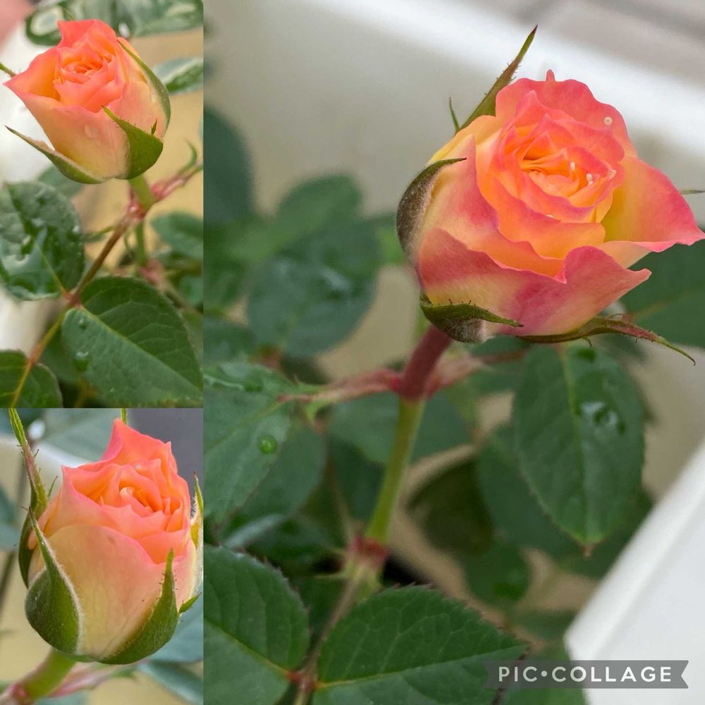 ☘️ミニばら☘️.....わぁ期せずしてこんなかわいいオレンジ色になって育ってきたよ🤭👀👀🍊🧡黄色だらけの固い蕾の中に少しだけ赤みがさしていた蕾があったんだけど、いつの間にか晴れた日に見たら変わっていたよ💕😍🫧🫧