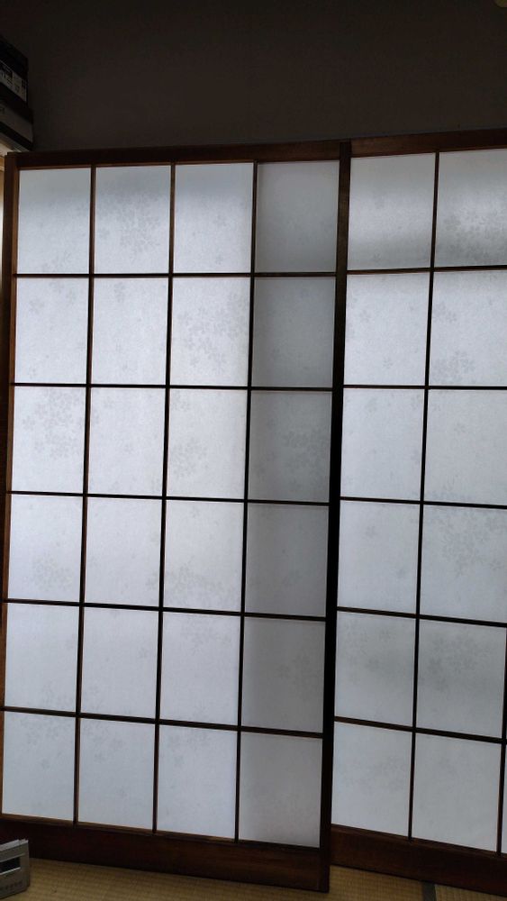 綺麗に剥がし、枠のホコリを取り、アイロンで2枚目を貼っている時、張り終わって立て掛けていた1枚が、倒れてきて😱ヽ(*>□<*)ノキャ━━ァ 手には高温のアイロンを持ち、下には、はり掛けの障子、