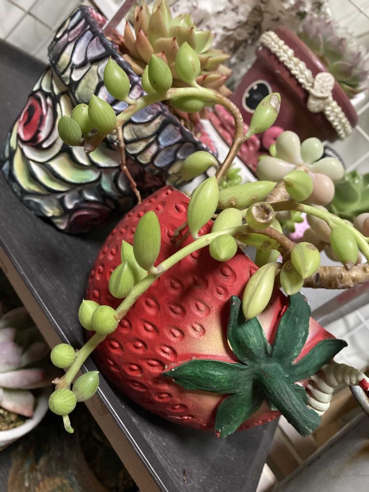 真っ赤な鉢🍓からアーモンドネックレスがニョロン~~~~~~~°∠