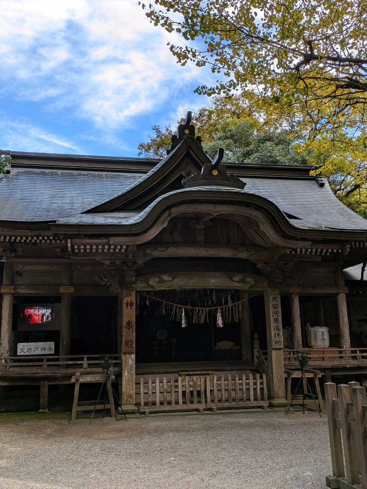古事記・日本書紀に記される神話の舞台となった、由緒ある神社。太陽神である天照大御神(アマテラスオオミカミ)が隠れた、天岩戸(あまのいわと)を祀っているところ。