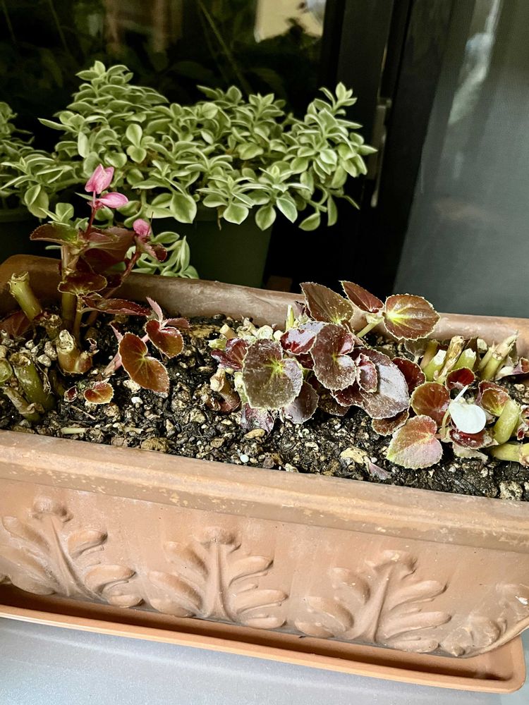 ①冬支度に長く伸びたベコニアをカットして窓辺に入れてから1ヶ月新芽が伸びて花が沢山咲きました 初めての試みで嬉しい