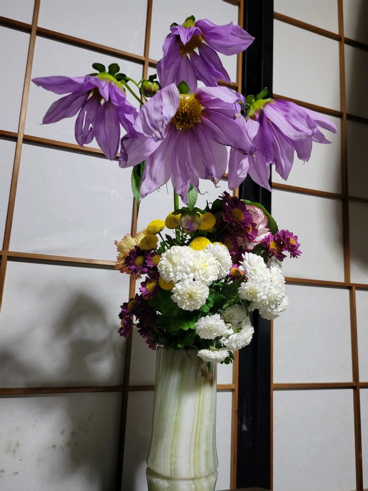 先端が折れたお花と倒れた菊を花瓶に挿しました🌼*・🌸✨
