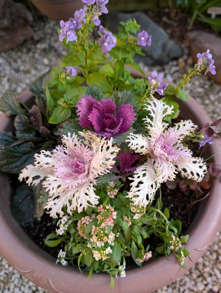 黒い葉牡丹が目をひき、家のアジュガで代用できそうと思い、レースの葉牡丹、アリッサム、ネメシアを購入しアジュガとクローバー☘を合わせて作ってみました💞