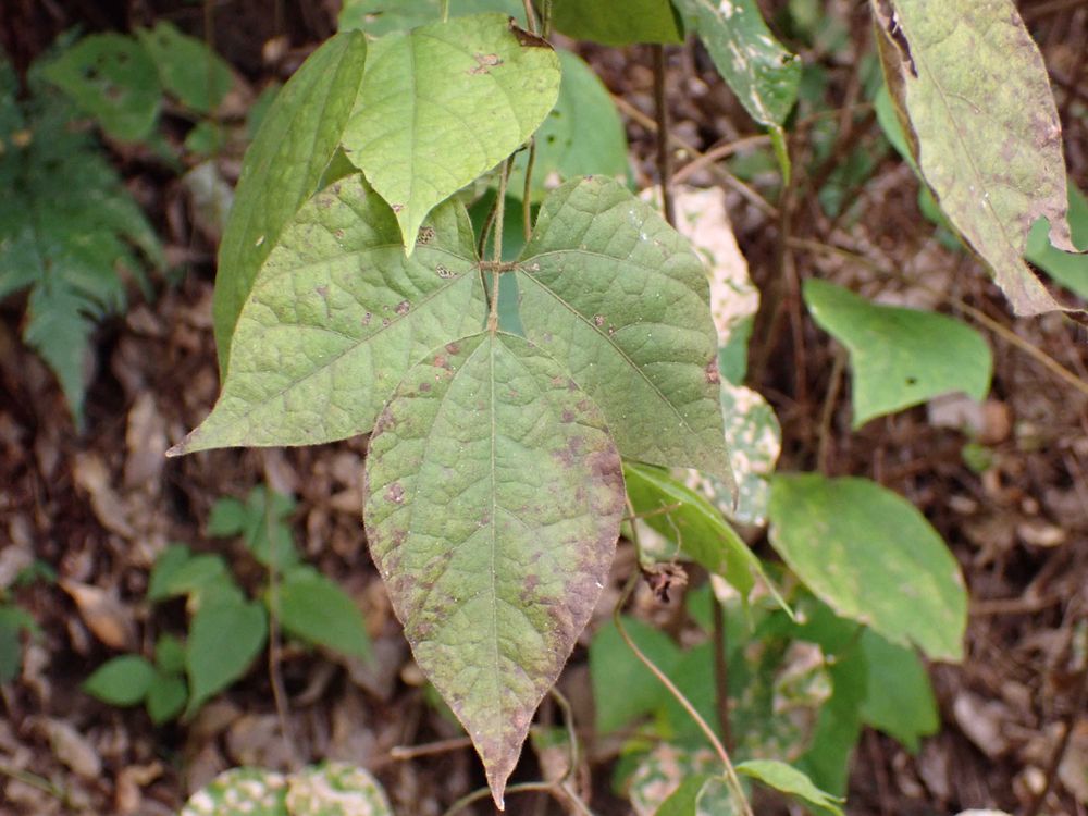 葉は、互生。長い柄に、3つの葉がついています。ひとつの葉は、卵型で、先が細く尖っていました。(③)