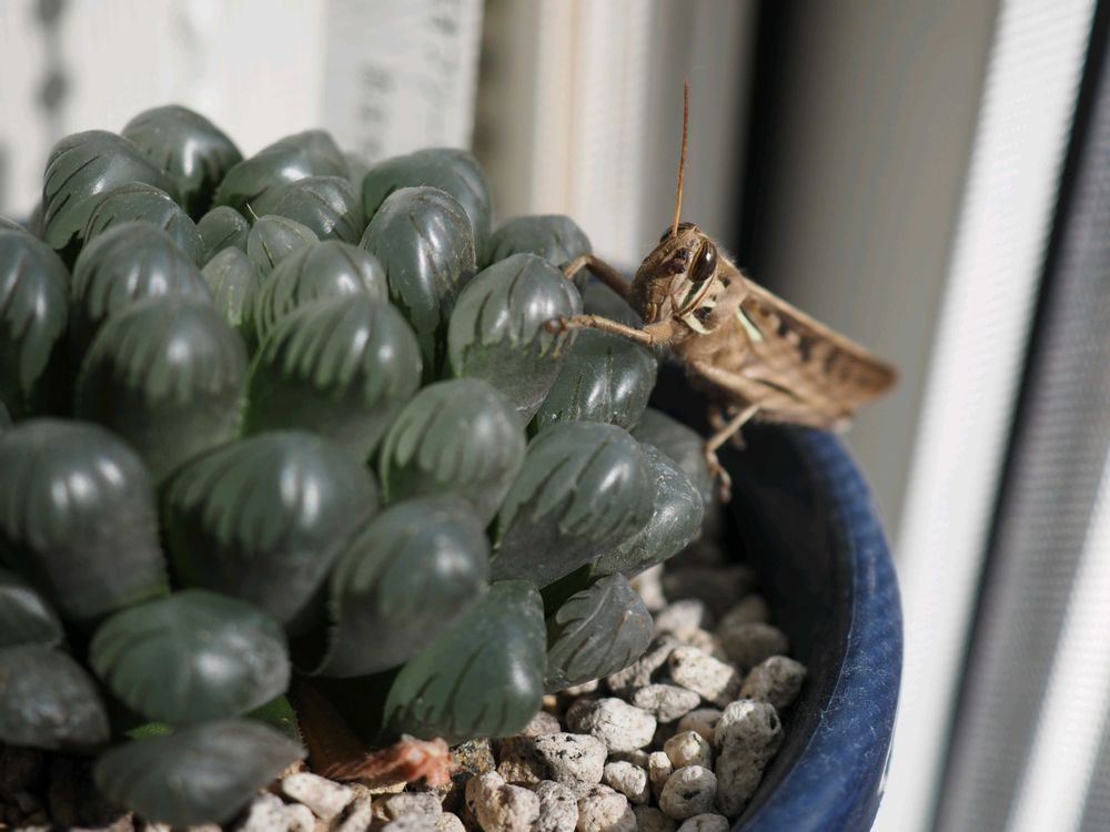 バッタ🦗くん、庭のアジサイを食い荒らしてる犯人だけど、ハオルチアは、かじらなかったみたい😮💨