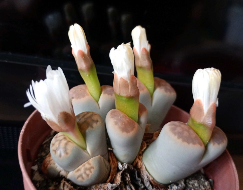 先日、花屋の店先の カートンに並べられ販売していた「リトープス」白花❀。中にはもう花が咲いているものも…、
