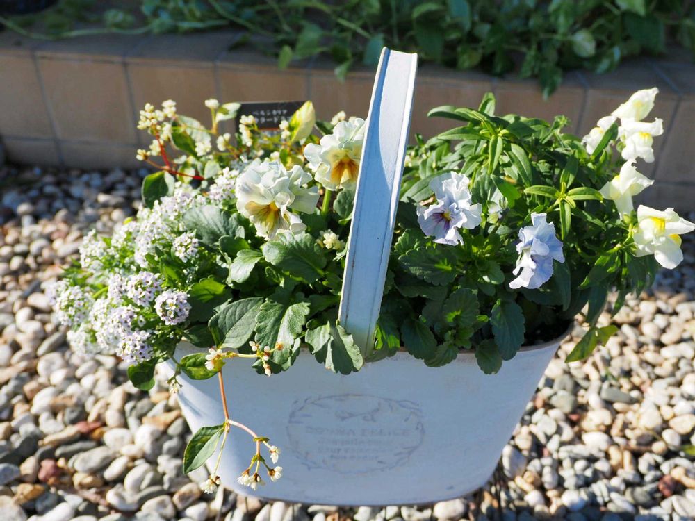 ブリキの鉢が花たちの魅力を際立たせてくれてますね🩵