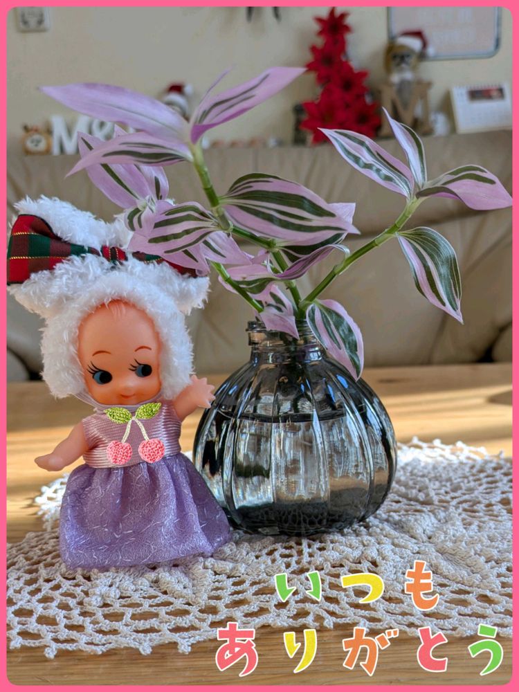 のりたまちゃんが贈ってくれたトラディスカンティアが伸びたので、✂️✨して名探偵みゆちゃんが贈ってくれたガラスの霧吹きの瓶に挿したら根が出たよ٩(ˊᗜˋ*)و”ワーイ︎💕︎✨