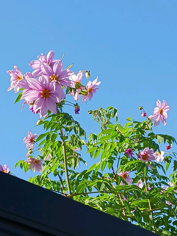 コウテイダリアが青空に映えて綺麗✨ですね。今日はピンク色お花シリーズですね。