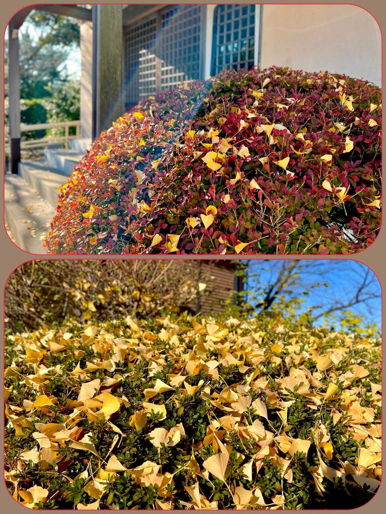 3枚目、ドウダンツツジやツツジの上にも黄色い落ち葉がたくさんでした。