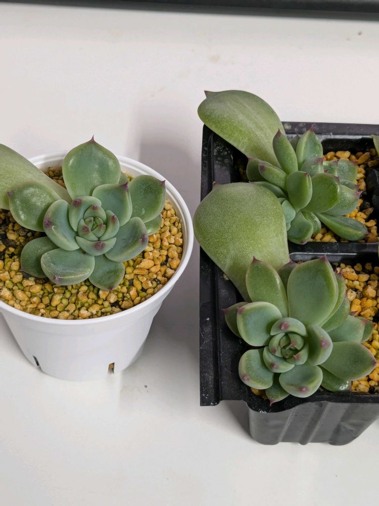 ②①のチワワンからとった葉挿し1号、2号、3号。こいつらは成長重視で培養土もお水もたっぷり。最近は実生用の微粉ハイポのお裾分けも。葉っぱでかいし厚いです😁