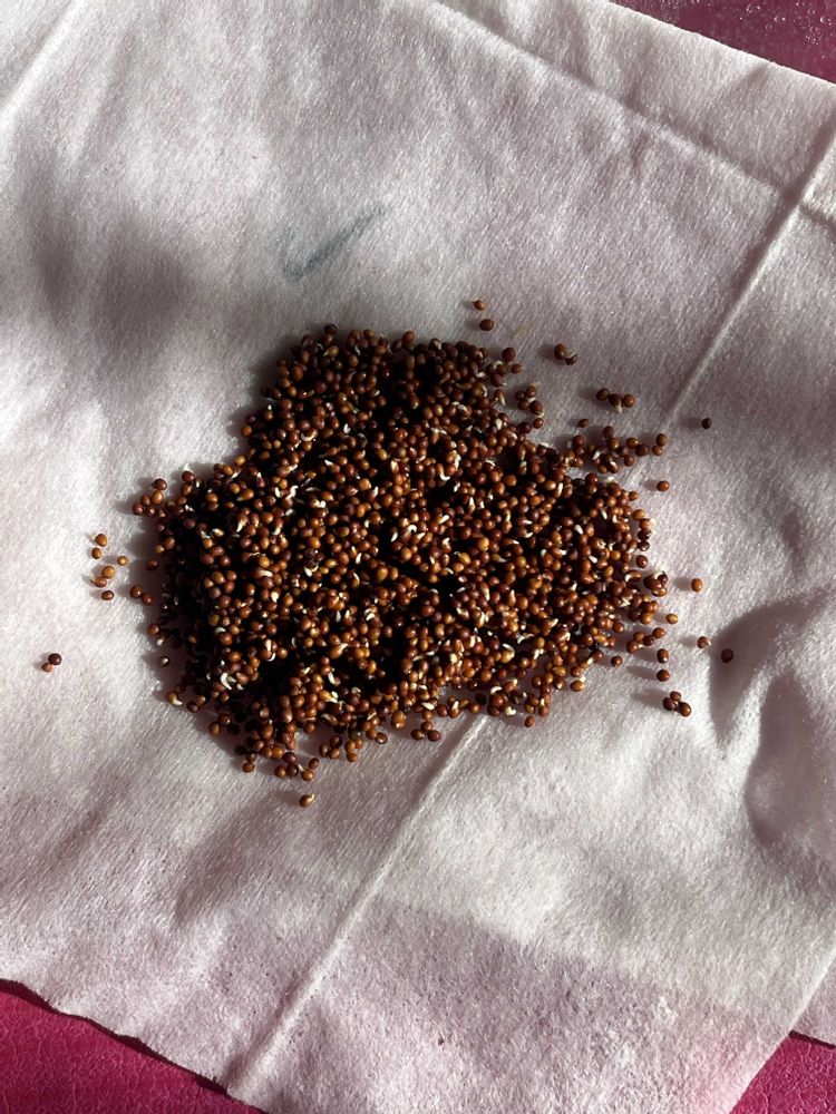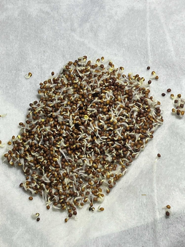 この多さの種に笑って、ごまかすって気持ちですが、芽がからまり団子状態、畝を作ってコロコロ丸まった種を無造作にまいたんですよん、