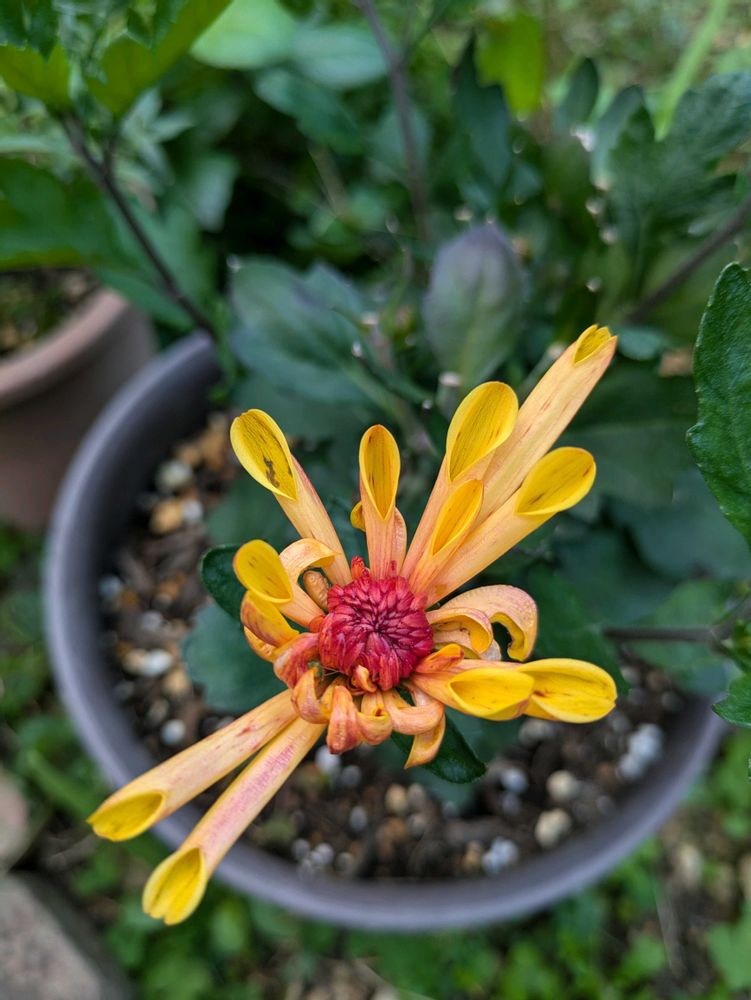 クリサンセマム マウントオービスク 赤っぽい色から黄色く咲きました。