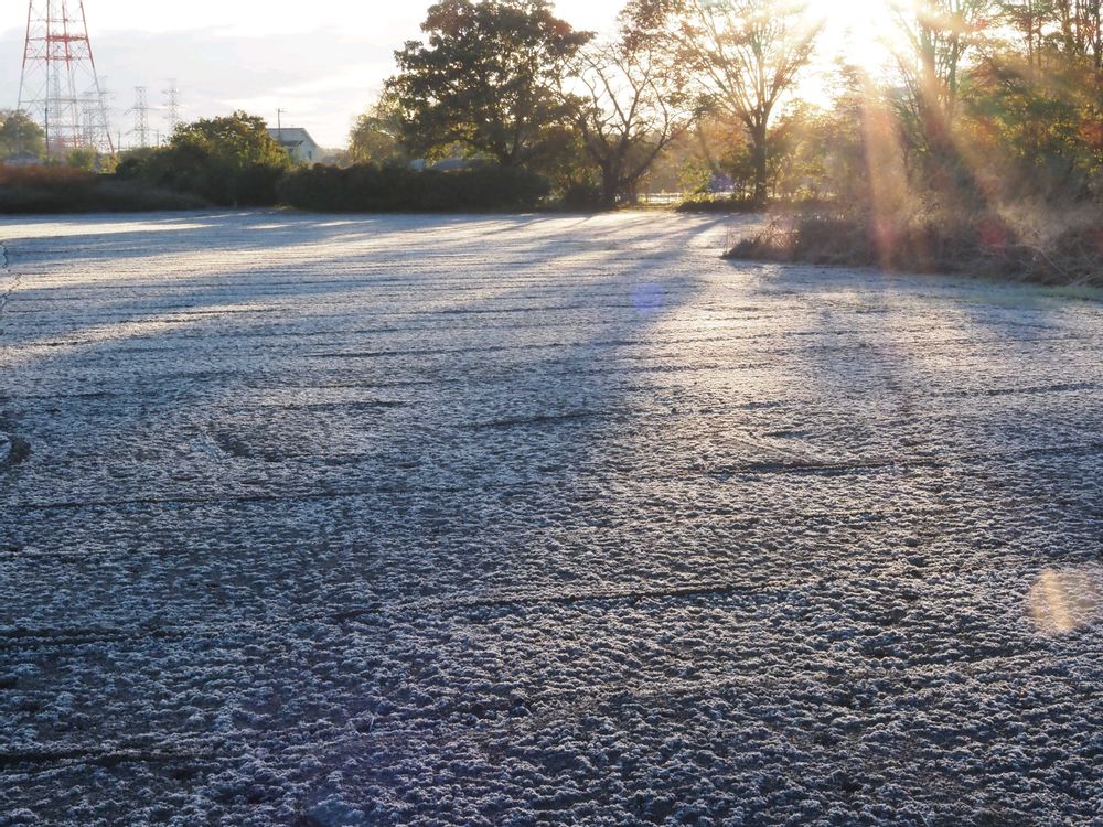 朝寒かったけど霜で真っ白になった畑と朝日は綺麗でした