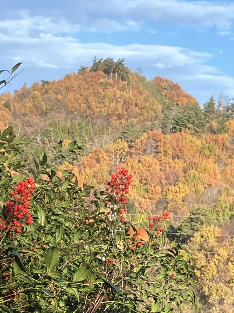 花見山公園は、標高が高いところにあるのですね💕 青いお空に紅葉と南天が綺麗です。
