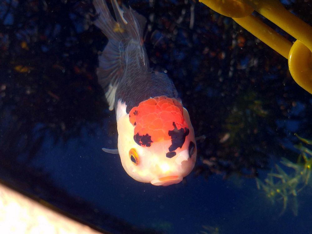 ④睡蓮がいなくなった睡蓮鉢の金魚。鯉?10センチくらいの子で、のぞき込んだら寄ってきました。