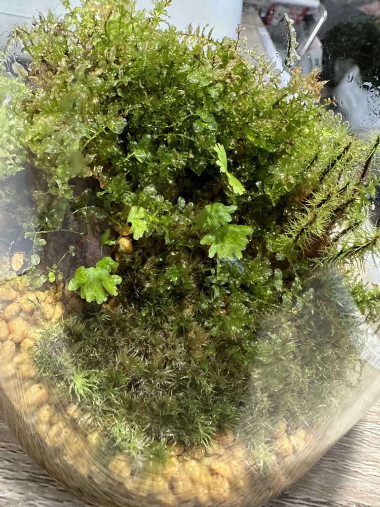 コツボゴケ、他苔のテラリウムの中に突然生えました2株のシダの様な植物!綺麗な黄緑色で1ヶ所から増えてます!