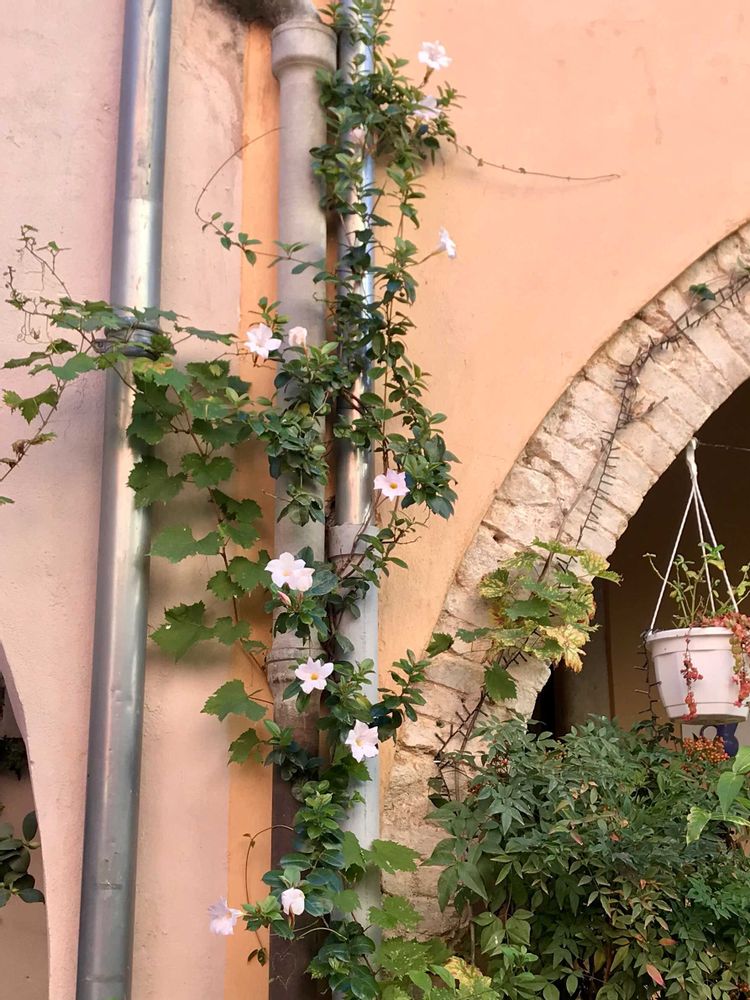 オレンジ🧡の壁に緑💚の葉っぱ🌱が映えていい感じ。サマードレスもまだまだ咲いてる👍