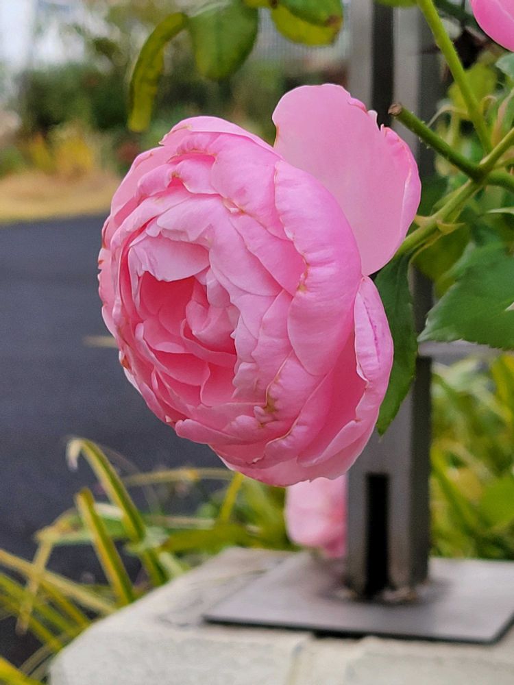 散策路沿いの花壇でコロンとした可愛いバラさんに出会いました。