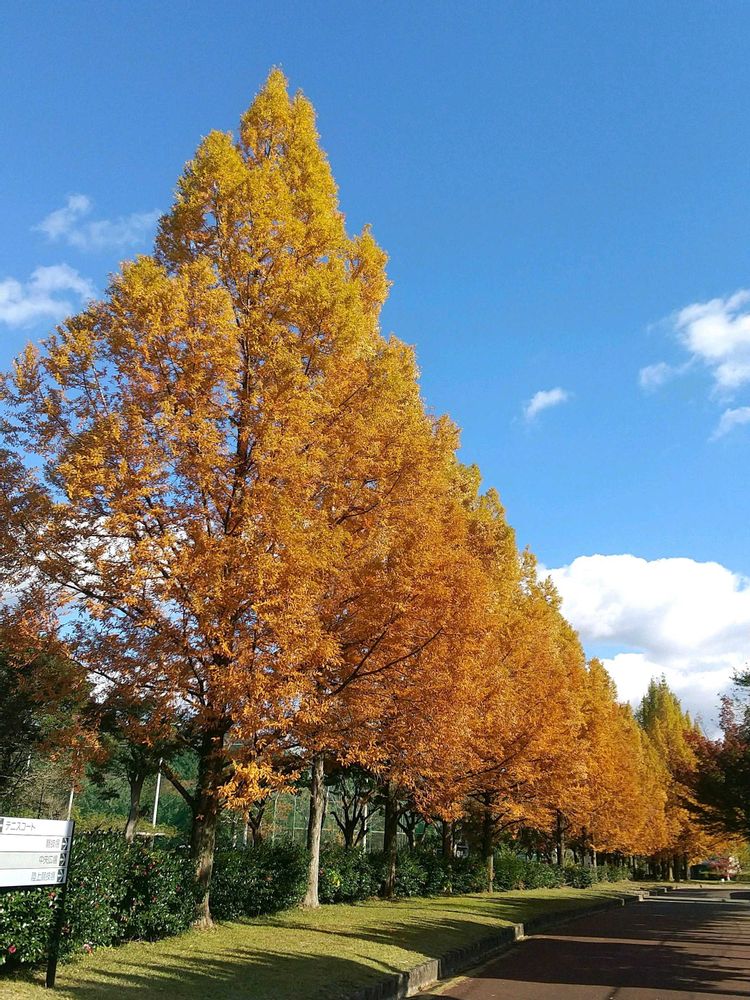 今日は公園散歩。メタセコイアの並木が色づいて来ました。日に照らされ黄金色に光っていた。🍁🌲🤗✌️🐶