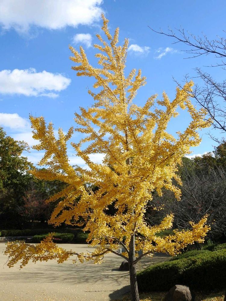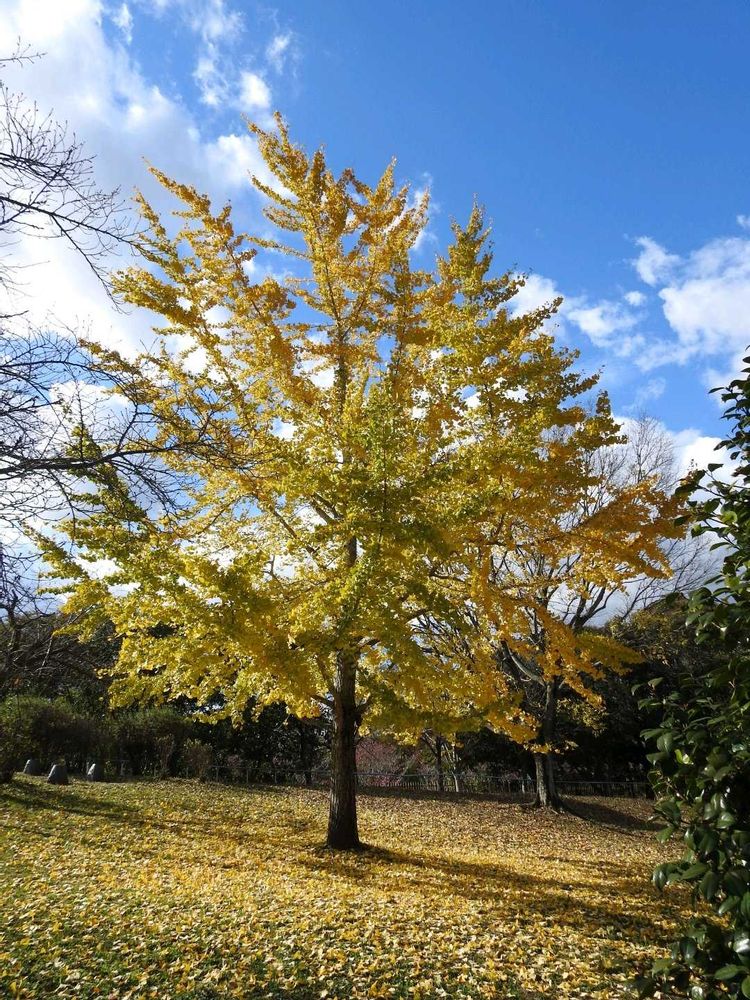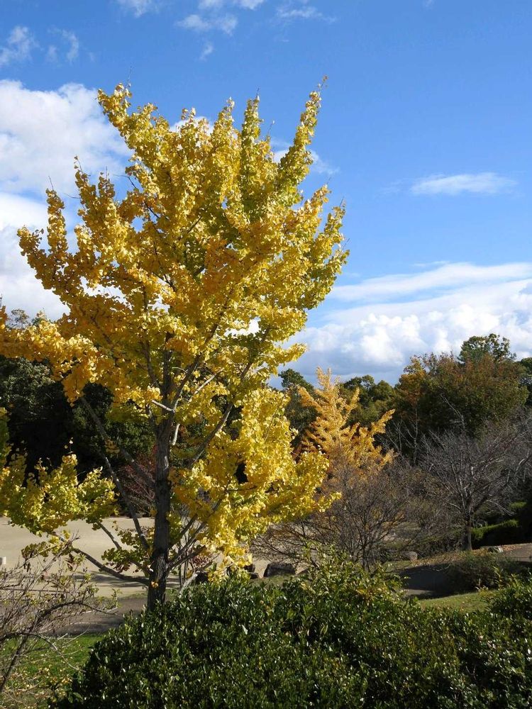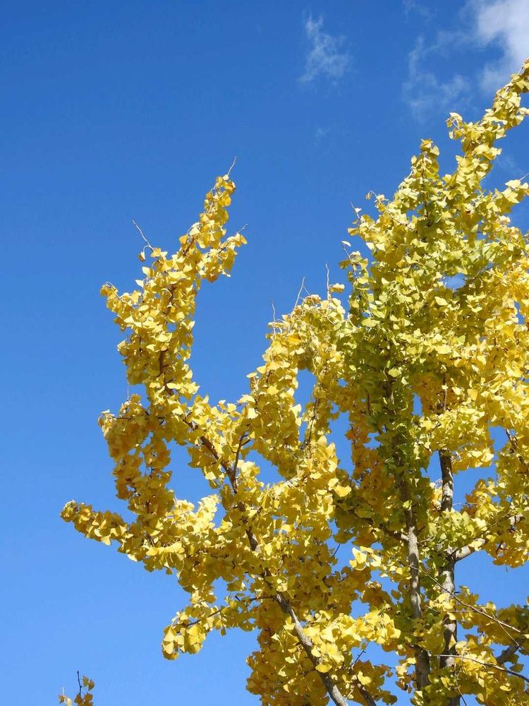 青空に銀杏の木がシルエットになっていいなぁ🤗今日は今季一番の紅葉🍁黄葉