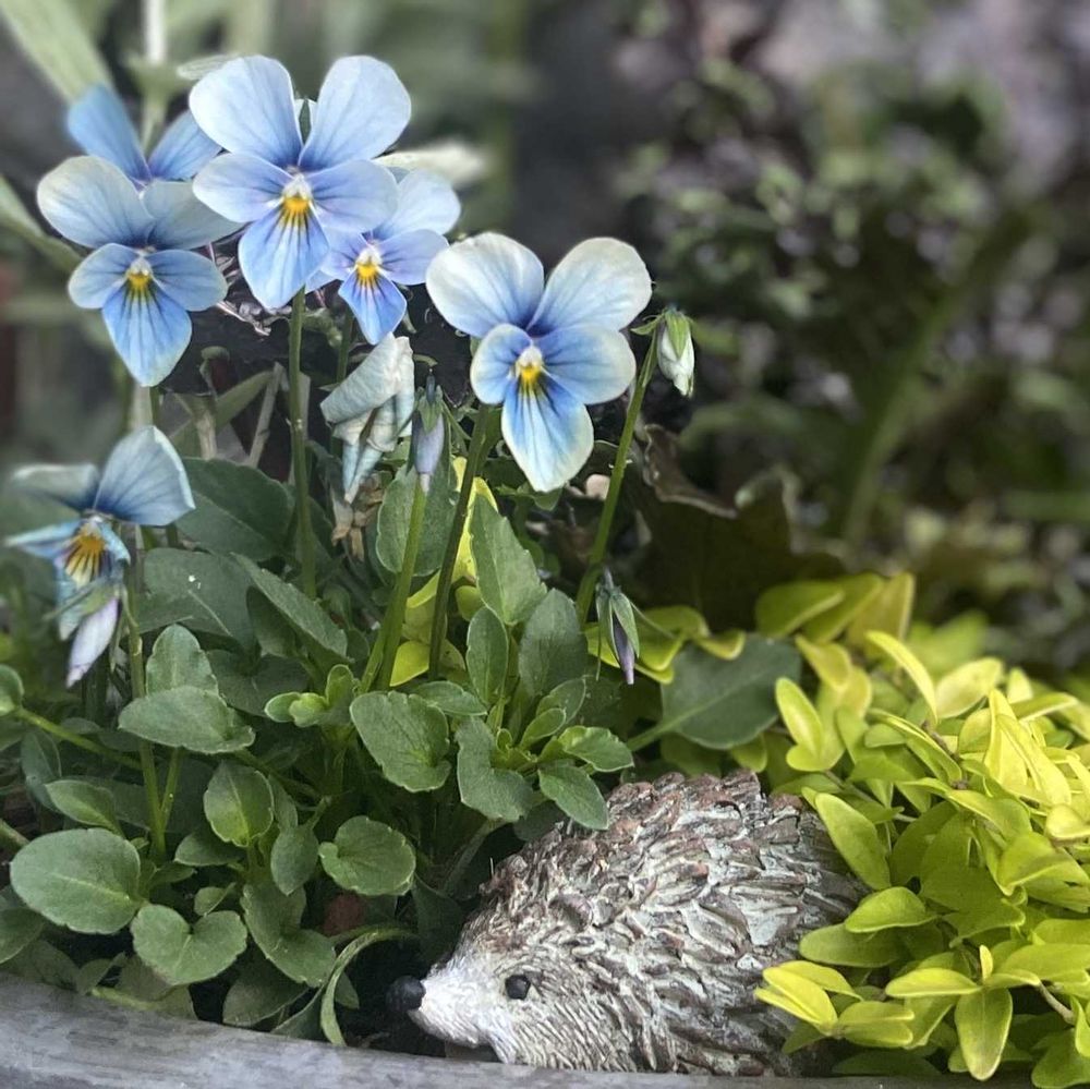ブルー系のお花を入れて寄せ植えを作ってみたんですが、ハリネズミさん出演を依頼🦔🩵