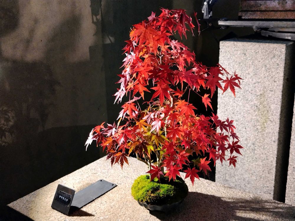 ヤマモミジの盆栽、半円球の器にこんもりと土を盛られてその上に苔が植えられ、苔の緑とヤマモミジの赤がよく合います✨👏👏👏