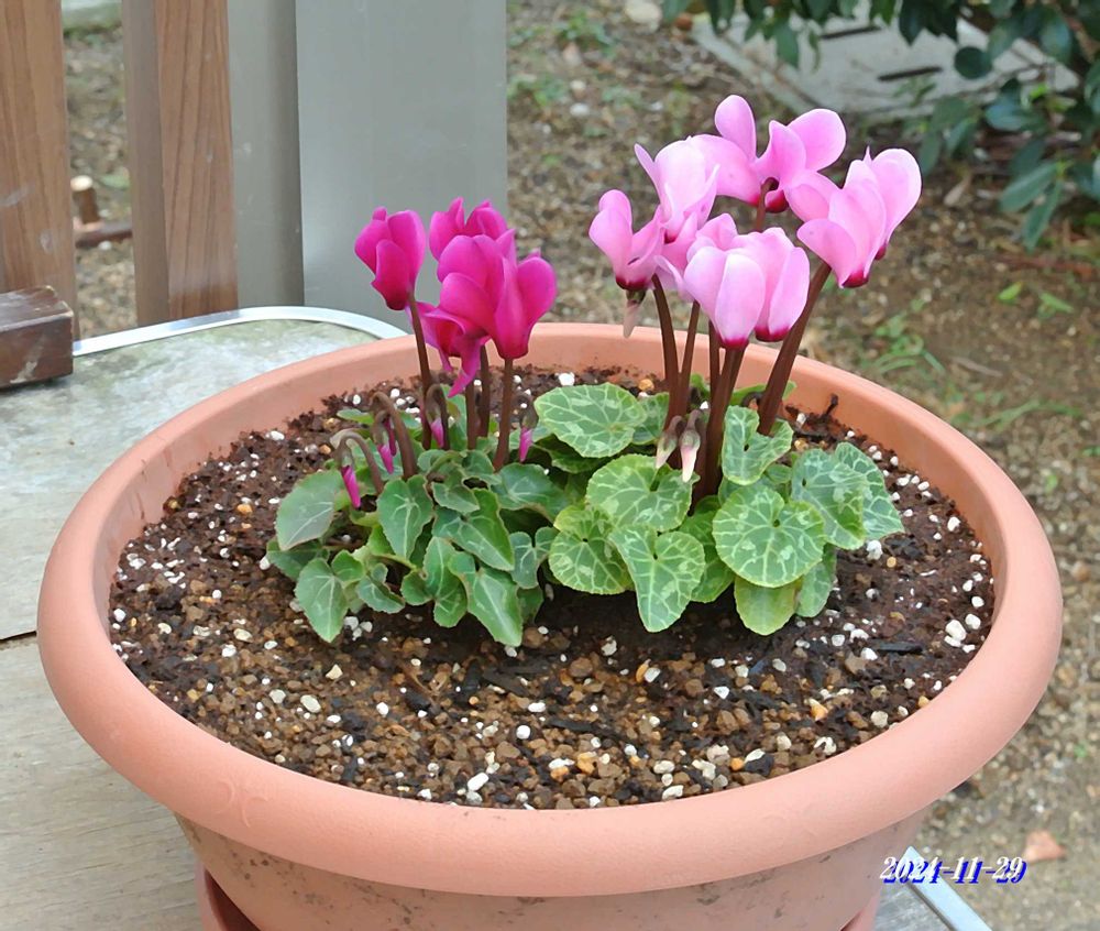 丸鉢に、ガーデンシクラメン、そして、今はわかりませんが、