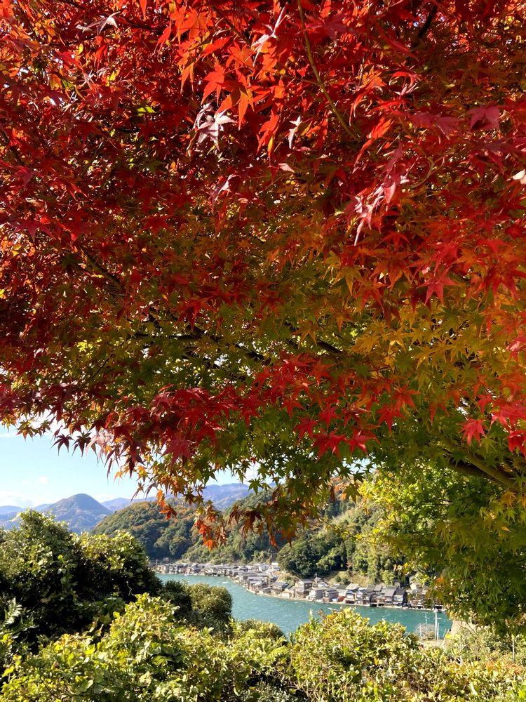 伊根の舟屋です。何年か前に行った時は遊覧船に乗って海から舟屋を観たので、今度は陸から観たくて車でグルーっと回りました。紅葉🍁も進んでて中々良い眺めやったわ💓