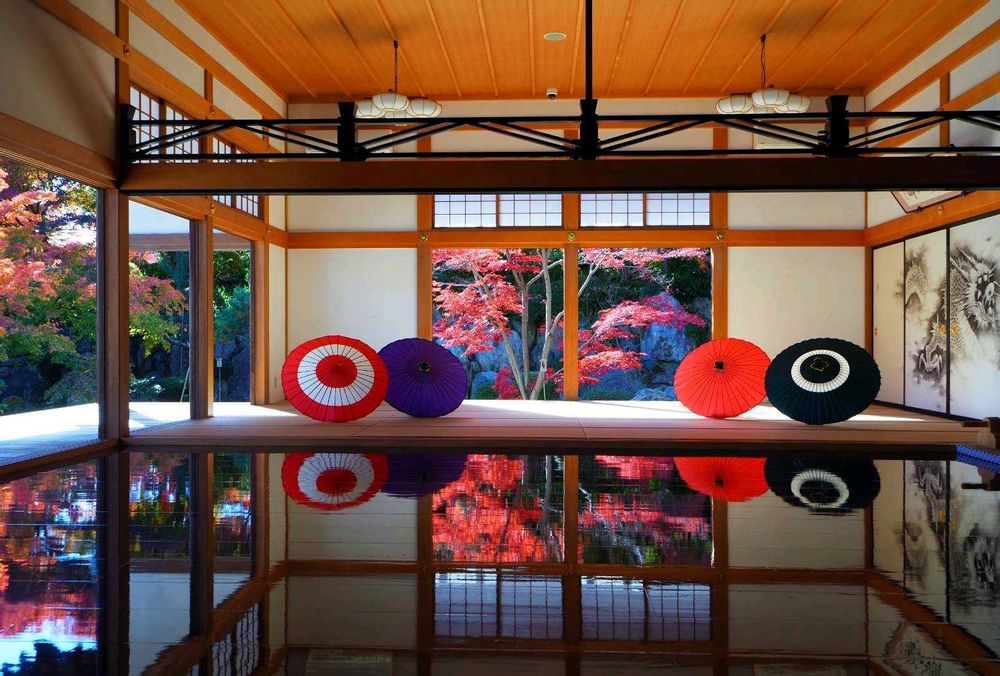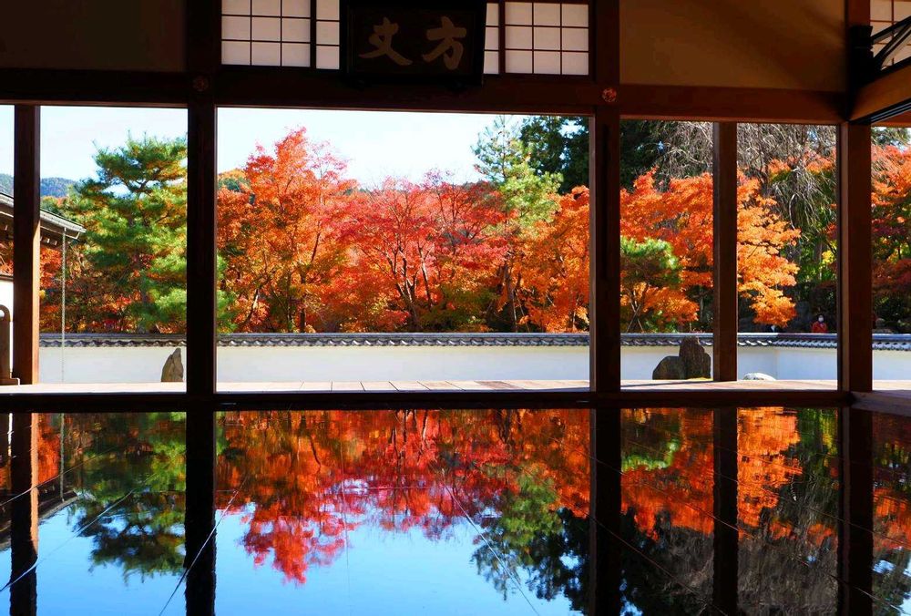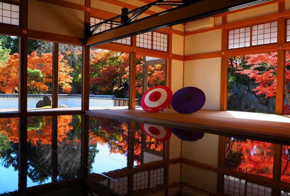 美しい赤く紅葉したもみじが、黒い床に写り込んでいました🍁