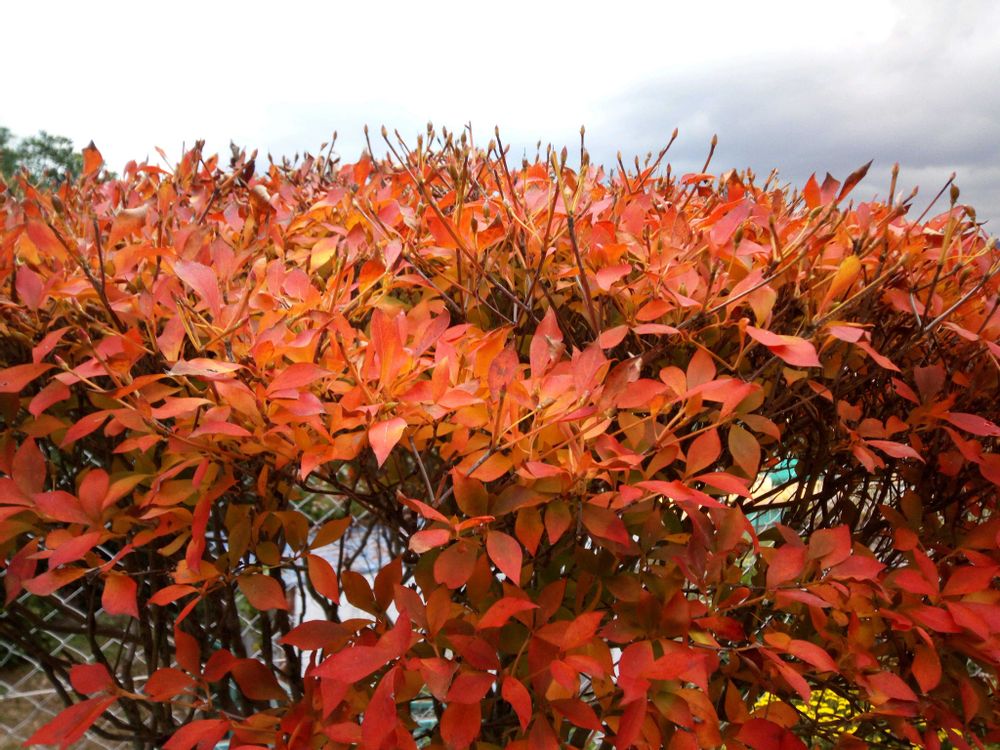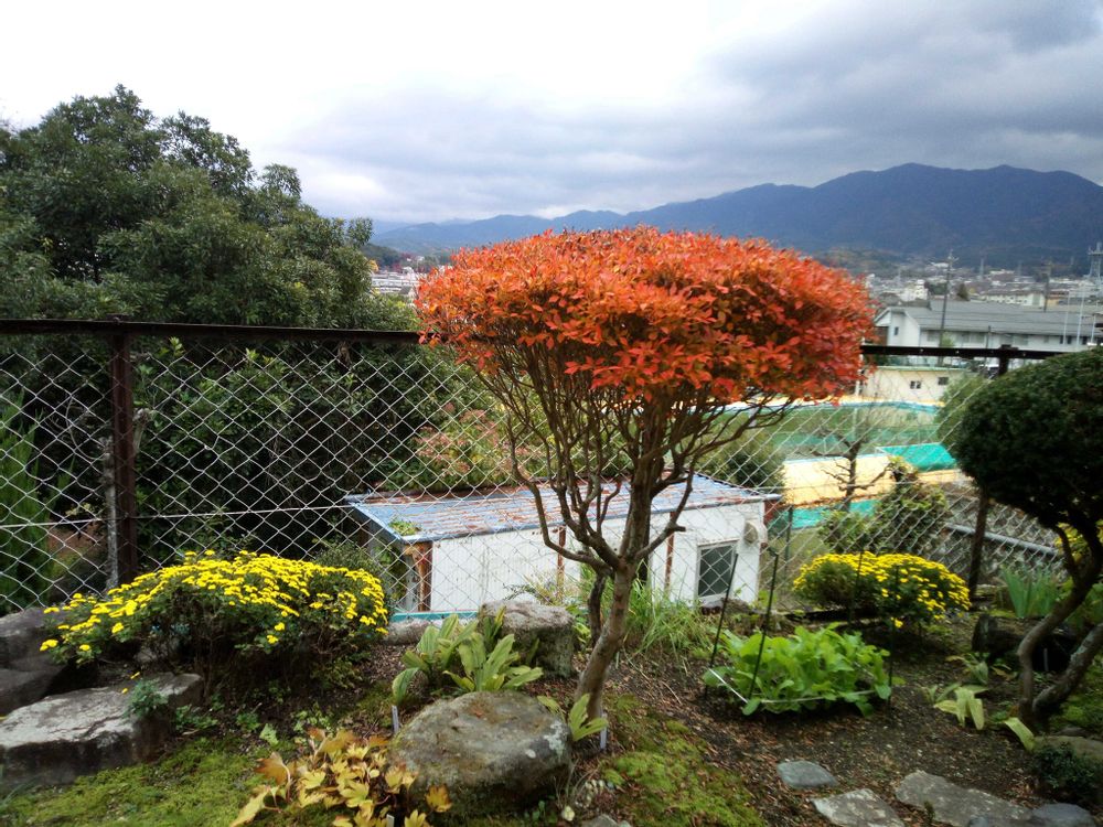 このところの冷え込みで、庭のドウダンツツジが赤く紅葉して綺麗です。黄色の小菊も鮮やかです。