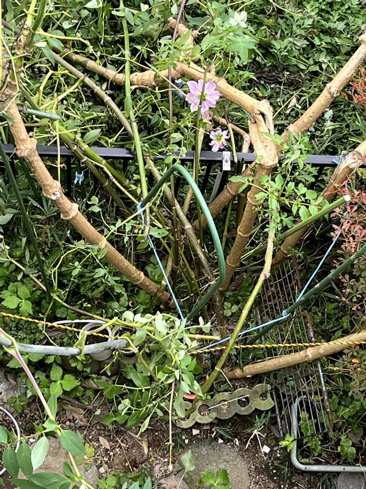 おまけに、緑のビニールロープでアチコチ引っ張ってます🤣(今年は7~10本咲いてるので)