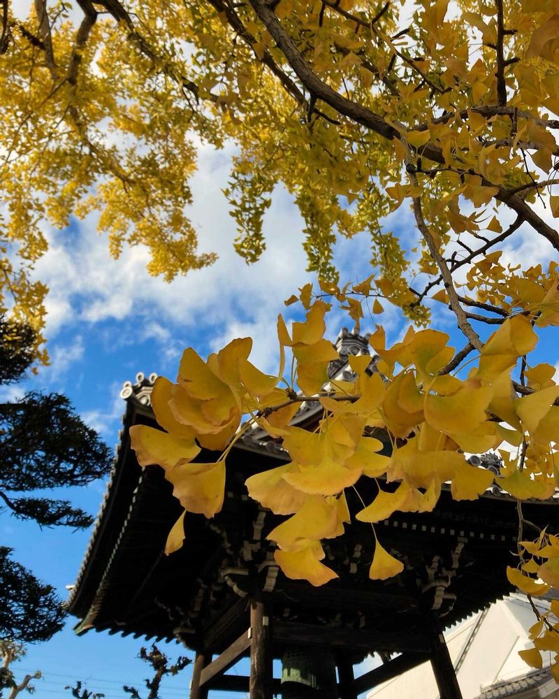 青い空にイチョウの葉っぱも