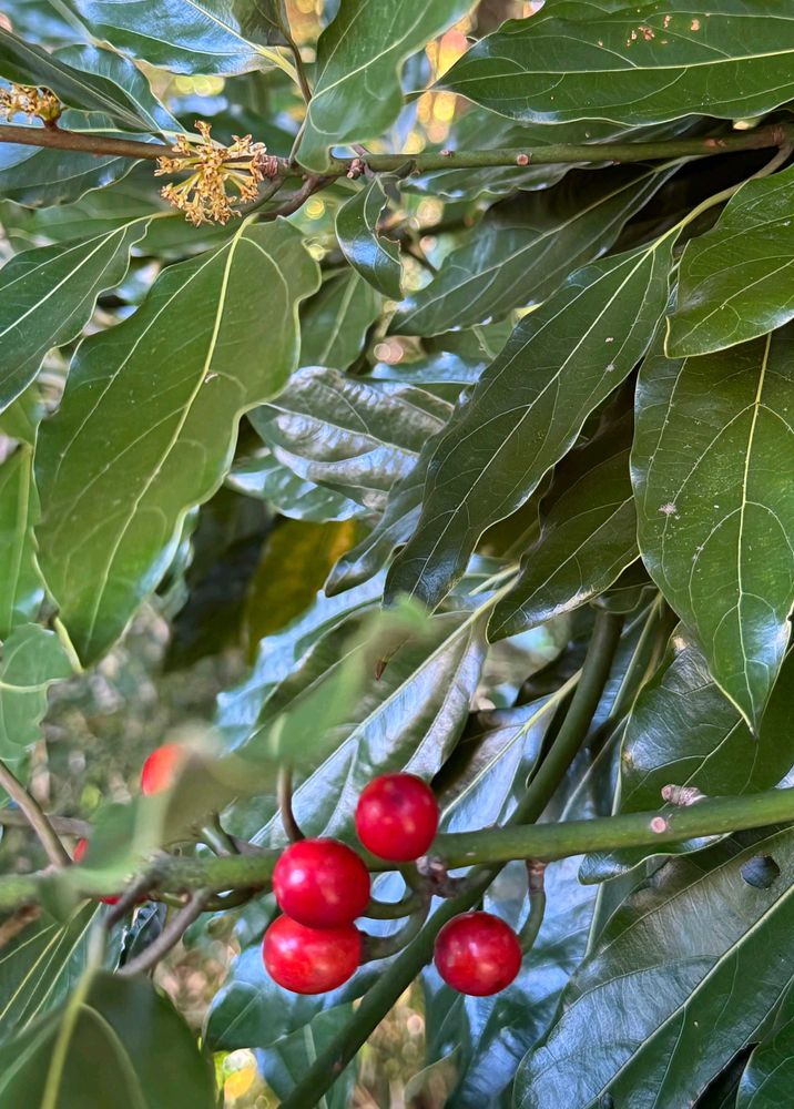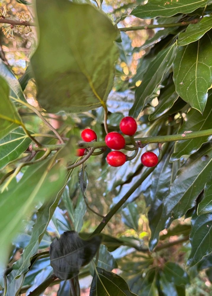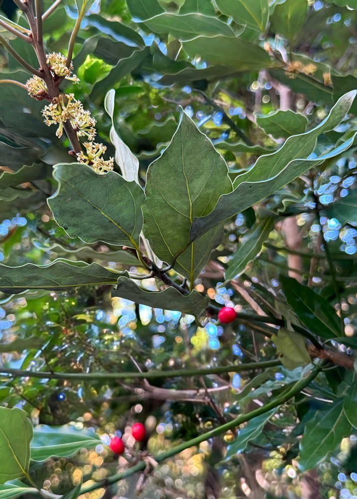 赤い実と雌花が同時に見られるシロダモの木に沢山実がなっていました♡🔴🌿